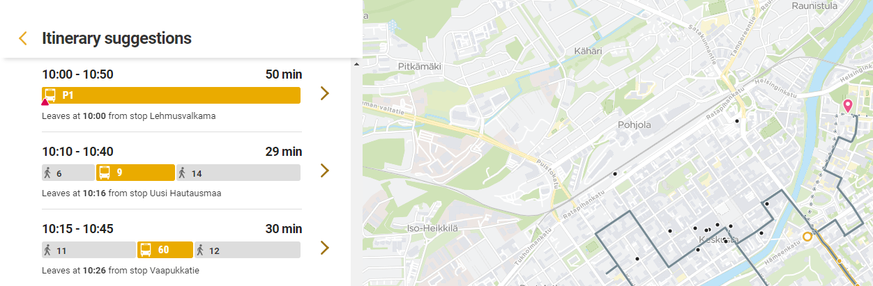 You can use the Föli journey planner for much more than finding a route between locations A and B. For example, you can find loading points near you, locate buses and print out bus stop timetables. The journey planner is easy to use both on a computer and a mobile device.