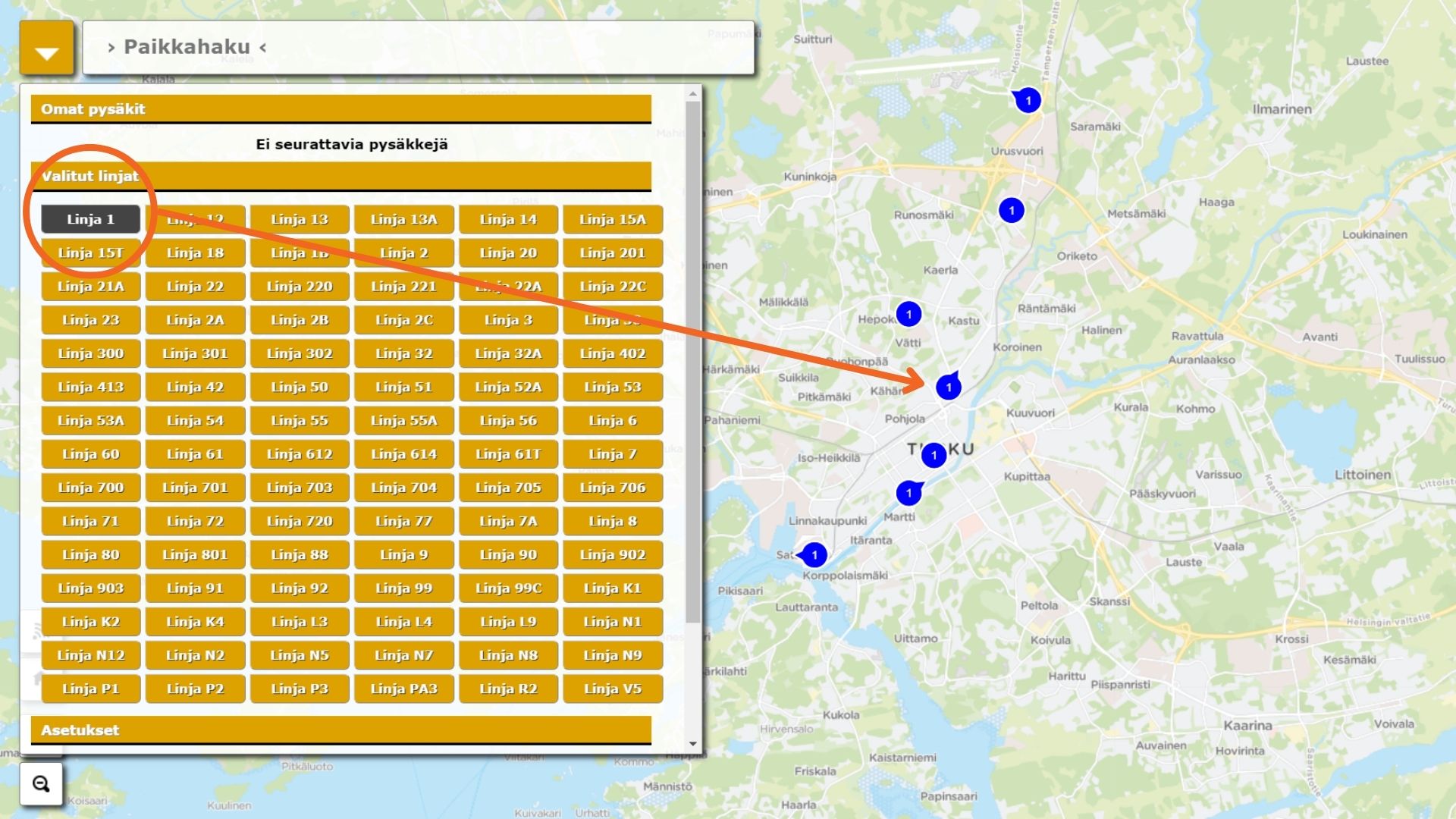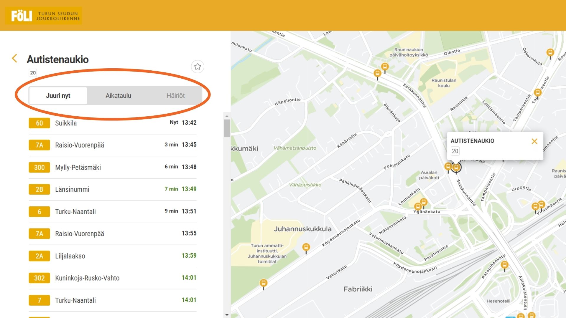 Buses on the map (Opens in a new tab) is a service that allows you to follow buses in real time. All Föli buses have a GPS that transmits real-time information about their location. The location data is used to display buses on the map and estimate the buses’ time of arrival. You can select which lines are visible on the map. Start using the service here: live.foli.fi.