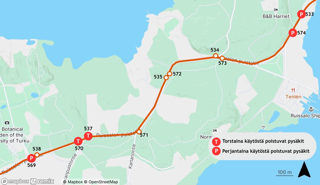 Pysäkit 537, 570, 666 Kansanpuistontie ja 595 Kansanpuisto ovat poissa käytöstä to 3. - su 6.7. Pysäkit 533, 574 Ruissalonsilta ja 569 Rauhalantie poissa käytöstä pe 4. - su 6.7.
