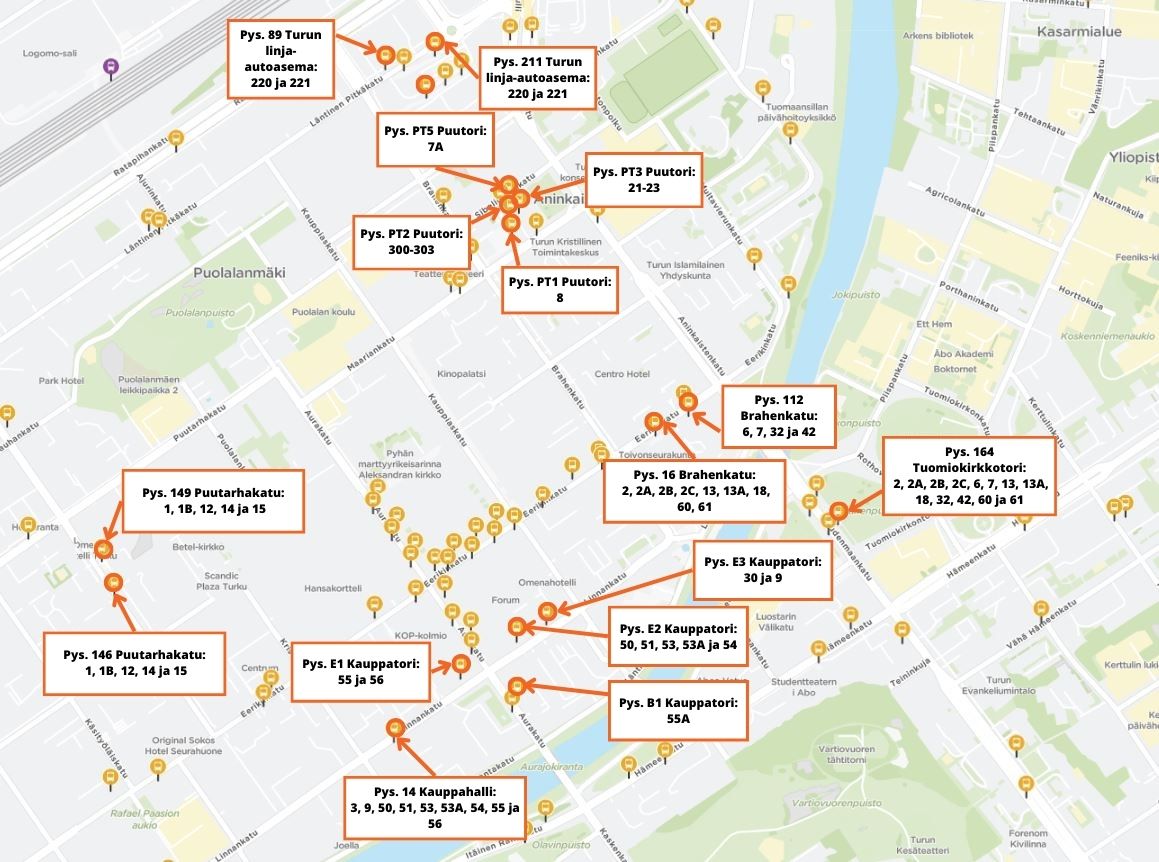 - Uudenmaankatu pysäkki 164 Tuomiokirkkotori Länsinummen/Liljalaakson suuntaan linjat 2, 2A, 2B ja 2C, Naantalin suuntaan linjat 6 ja 7, Takakirveen/Impivaaran suuntaan linjat 13 ja 13A, Runosmäen suuntaan linja 18, Pernon/Pansion suuntaan linjat 32 ja 42, Suikkilan suuntaan linja 60 sekä Vienolan suuntaan linja 61.