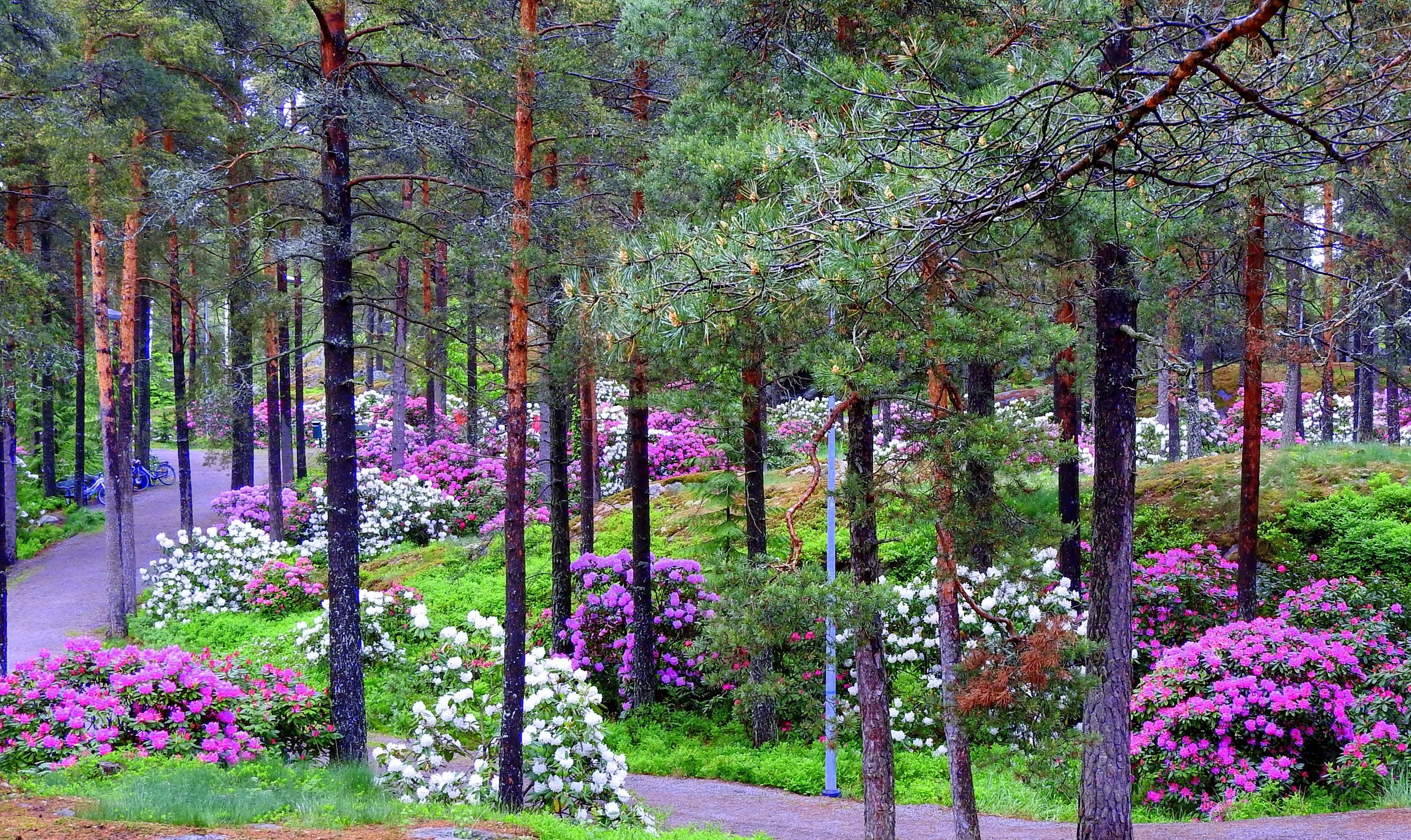 Hundratals rhododendron blommar från slutet av maj till kring midsommar. Det lönar sig att besöka parken då.